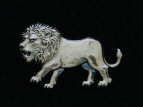 いかがですか。堂々としているでしょう。前足を上げ、険しい表情で大きく口を開けて吠えています。相手を威嚇している場面でしょうか。頭の大きいところなどライオンの特徴をよく捉えたリアルなデザインです。このタイピンを着けると少し強くなったような気がします(笑)。