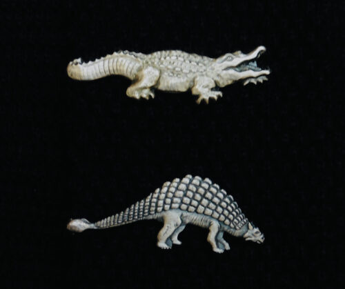 下は何だか分かりますか?実は遠い昔に絶滅したと言われる恐竜の一種です。名前をアンキロサウルスと言う草食恐竜です。体長が5~10mで体重は4.5トンもあります。全身が鎧で被われていて、尻尾の先端には硬い骨の塊が付いています。これらを武器に天敵のティラノサウルスなどに対抗していたようです。恐竜のタイピンと言うのは珍しく、私も持っているのはこのひとつだけです。