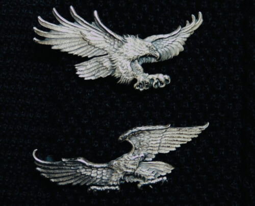 下は3羽のカモメを組み合わせたデザインで、3羽が仲良く飛んでいる場面でしょう。シンプルなデザインですが、とてもバランスよくまとめられているので、作者のセンスの良さが伝わってきます。こちらは巣立ちのイメージがあるので、大学の卒業式によく着けて行きます。