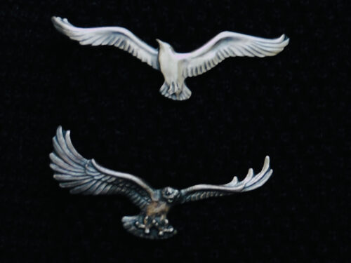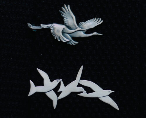 上は夫婦鶴でしょうか。夫婦仲良く旅をしている感じです。二羽の羽の形が飛翔の動きを巧みに伝えています。昔なら結婚式に招待された時などに着けて行ったものですが、近年は結婚式そのものが執り行われないので、なかなか出番がありません。