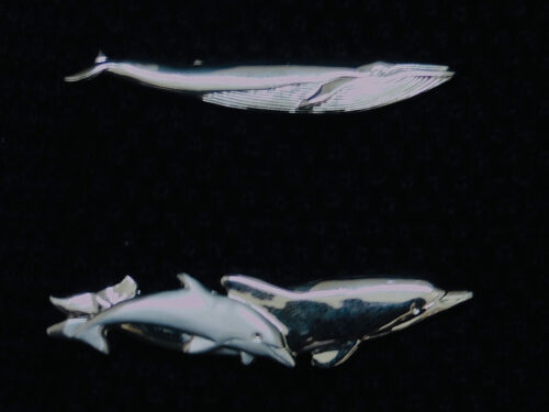 上はシロナガスクジラです。地球上で最大級の大きさを誇り、知能も高い生き物です。ちなみに巨大な草食恐竜のブラキオザウルスが体長30mですが、シロナガスクジラは大きいものでは33mにもなります。このタイピンも悠然と海中を進んでいくシロナガスクジラの雄姿を見事に捉えています。