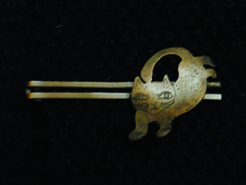 ところでこのタイピンは私のコレクションの条件から一つ外れています。何だか分かりますか?それは横バーがあることです。しかし猫のタイピンが欲しかった私は、この横バーは猫が飛び越えたハードルだということにして自分を納得させ購入したのです(笑)。