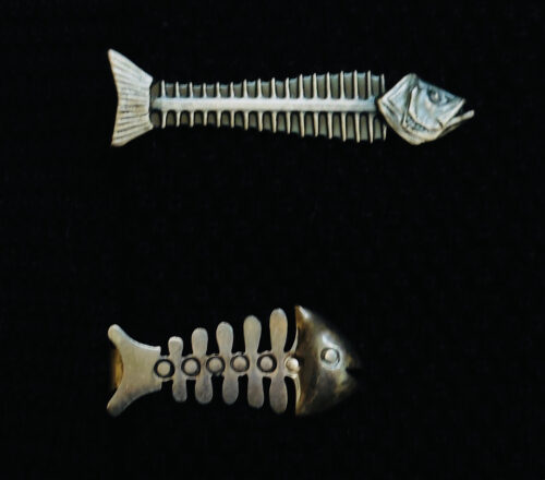 上は魚の王様と言われる鮭です。きれいに食べられてがっしりした骨だけの姿になっています。下は単純化されているので魚の種類は特定できませんが、デザインもユーモラスなのでマンガ的な魅力があります。いずれも着けた時は気づいた人の反応は強く、コミュニケーションのきっかけになります。