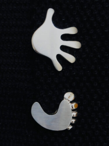 ご覧の通り手と足です。どちらもインパクトがありますが、目立つのは上の開いた手で、よりユーモラスなのは下の足裏でしょうか。よく見ると足の裏と足の指は表面の処理が異なっていて、裏は艶消しで指は光っています。いずれにしろ着けた時の効果は抜群で、「こんなタイピンがあるんですね!」と多くの人に驚かれます。やはりデザインに遊び心は欠かせませんね。