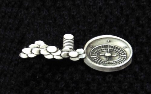 カジノでお馴染みのルーレットに使う回転する円盤と賭けに使うコインです。「カジノの女王」と呼ばれて人気のルーレットをタイピンにしてしまうという発想がすごいですね。横長の形状にするために多数のコインを使った工夫が光っています。このタイピンをしていたら、運が回ってくるかもしれません。しかし私はカジノには行ったことがないし、ルーレットもやったことがないので、このタイピンをしていく機会がありません(笑)。