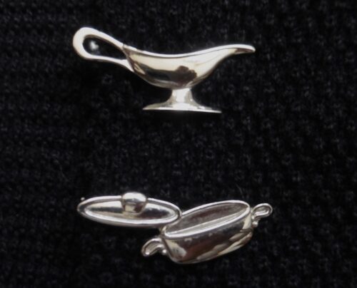 若い頃外食をしたレストランで、ソースポットにカレーのルーが入って運ばれてきた時には、何とも高級な感じがして嬉しくなったものです。このタイピンはそのソースポットを真横から捉えて、そのシルエットをシンプル且つ整然と再現しています。金属の質感も申し分ありません。