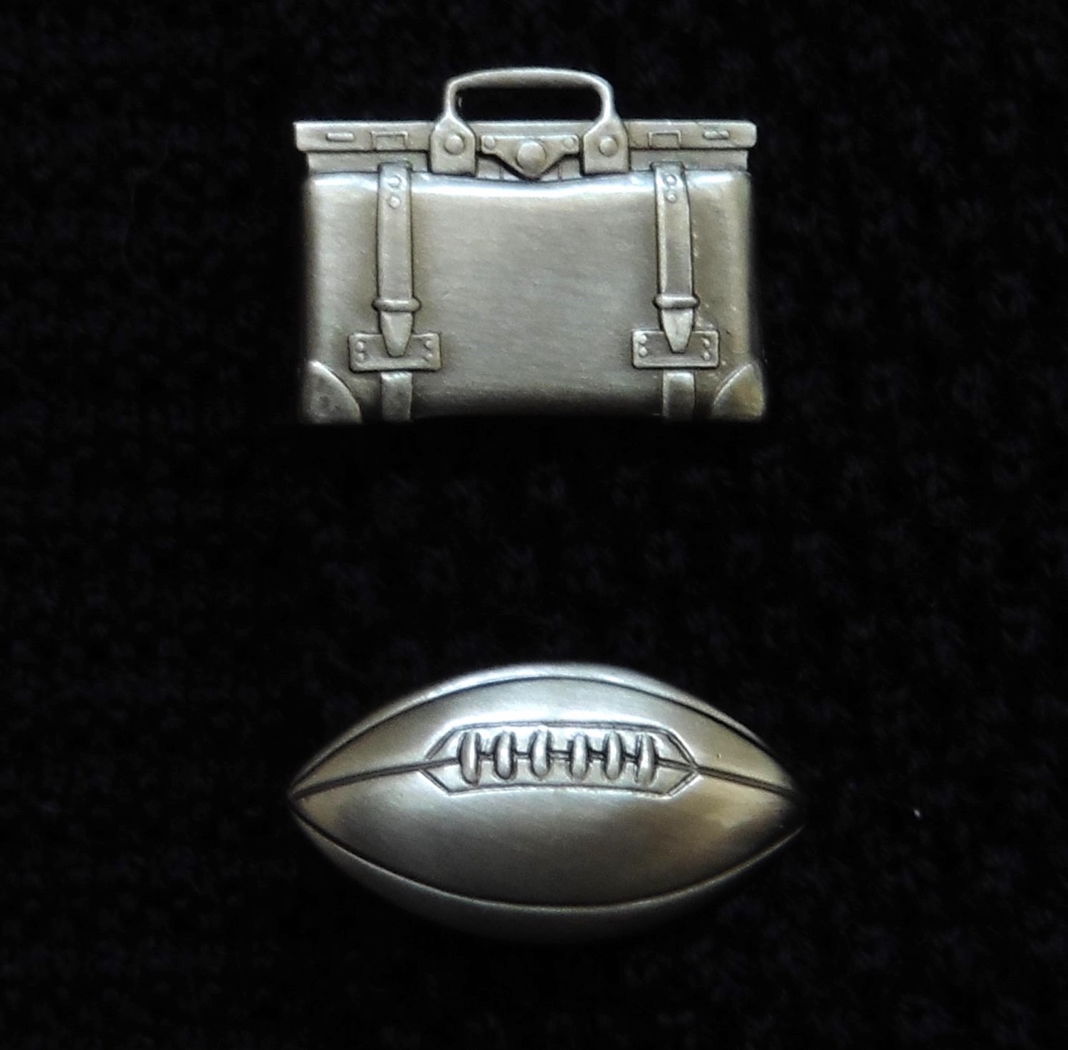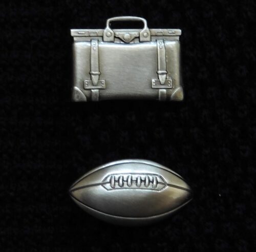 この二つもとてもリアルな造りですが、注目ポイントは実は大きさなのです。なんと旅行鞄の方は幅が2㎝、フットボールは幅が2.4㎝です。その小ささが逆に魅力となって人目を引くので、この二つも結構人気があります。ただこれだけ小さいとニットタイの方もかなり細めで薄手のものを用意しないといけません。私の場合は夏用に買ったニットタイが2本あるので毎回それに着けていましたが、近年の猛暑で盛夏にネクタイをすることがなくなってしまったので、最近はなかなか出番がありません。