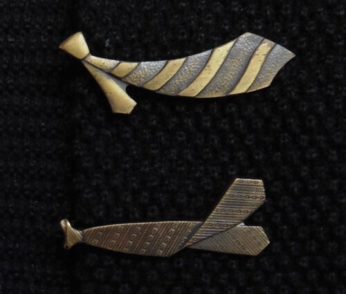 ネクタイピンのデザインがネクタイだなんて、凄すぎません!このユーモアとウィットには私も参りました。最初に入手したのは上のタイピンです。形状に躍動感があっていいですね。しばらくしてから下のタイピンを見つけましたが、こちらはさらに凝っていて、ネクタイの裏も見せるというひねりようです。細部の造りもリアルです。作者は違うと思いますが、このアイディアが出た時は嬉しかったでしょうね。