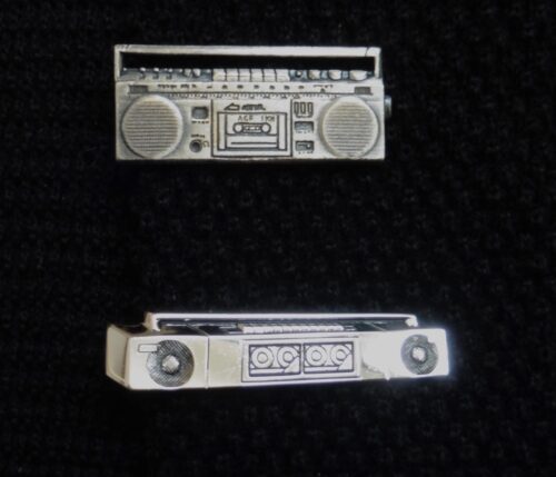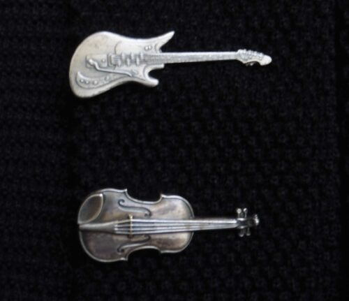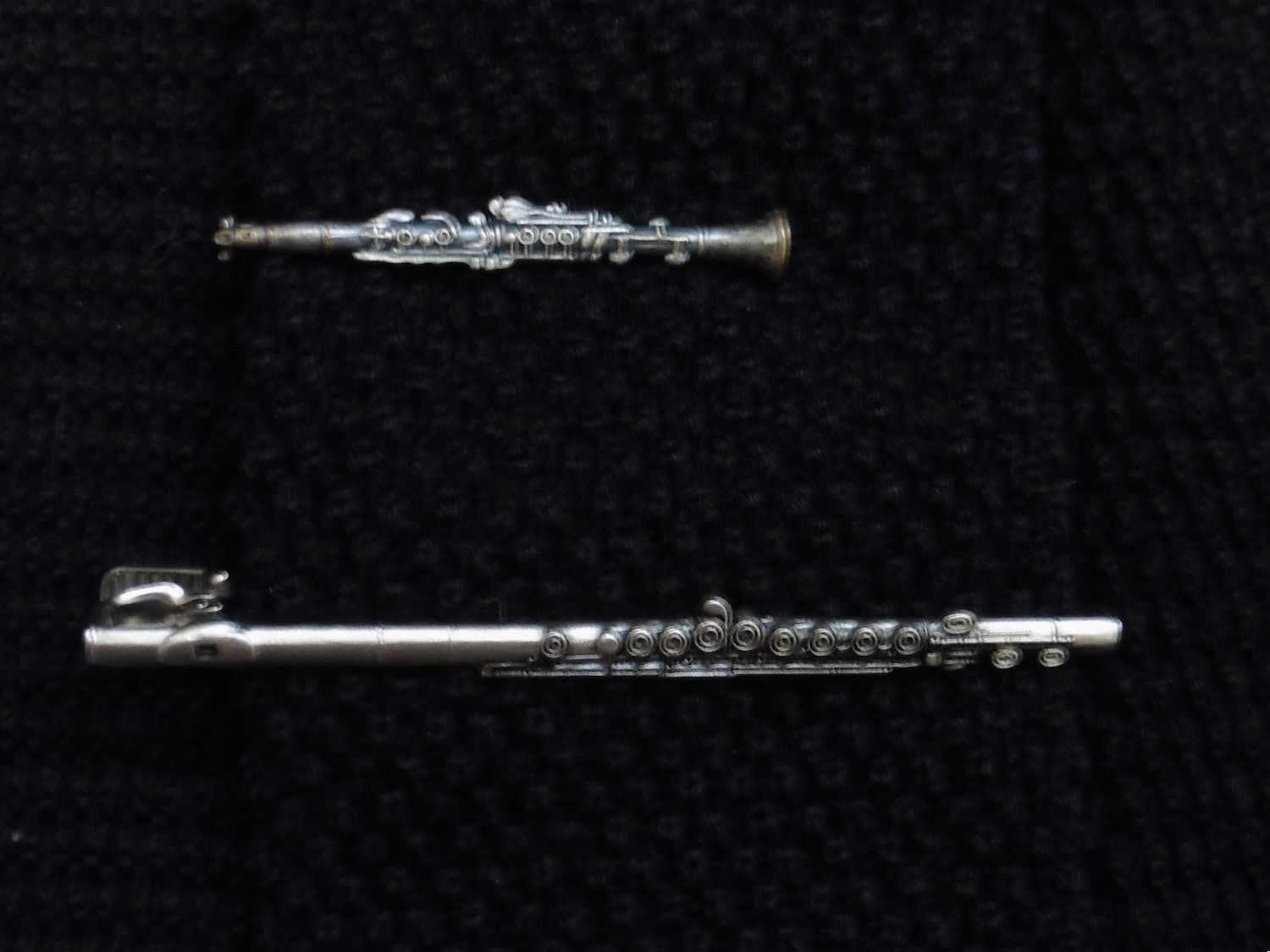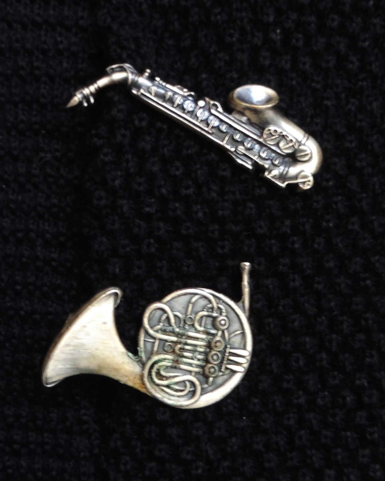 この二つは前の二つに比べると楽器の形状が変化に富んでいて、見るだけでも楽しくなってきます。やはり音の出る先端部分がラッパ状に広がっているのが、楽器らしくていいですね。タイピンとしての周囲の反応もこの二つは断トツです。