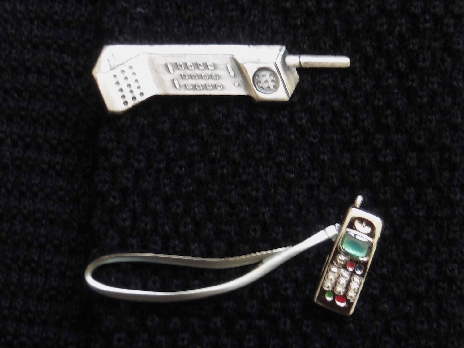 どちらも電話に関した機器ですが、皆さんは何だか分かりますか?上は家庭用固定電話の子機で、下は旧式の携帯電話です。我が家にはまだ固定電話があるので、このタイプの子機もあります。携帯電話の方は私が最初に使っていた機種に似ています。このデザインのすごいところはストラップです。裏の留め具とはギリギリのところで接続されています。