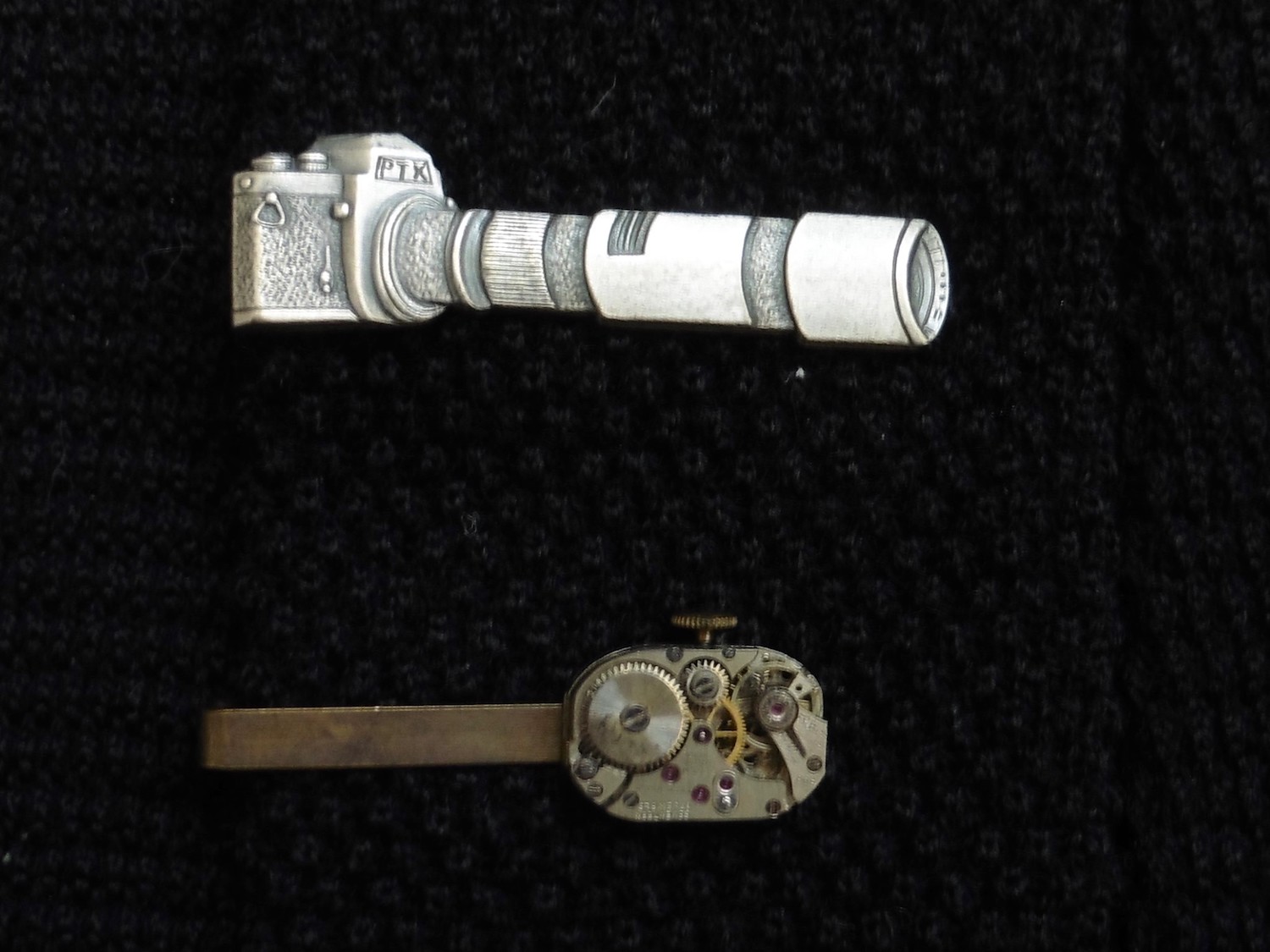上はカメラですが、長い望遠レンズが付いています。見るからに重そうですね。機種は「PTK」のロゴが見えるので、有名なアサヒペンタックスのようです。下は何だか分かりますか。実はこれ、時計なんです。文字盤が取れて、中の構造がむき出しになった状態です。よく見ると細部まで忠実に再現されていて、タイピンとは思えないほどです。バーが付いているのでコレクションの条件に抵触していますが、完成度の高さに脱帽してコレクションに加えました。